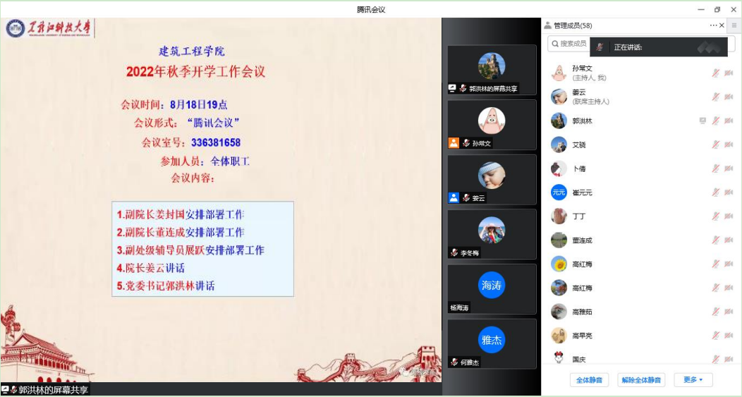 副院长姜封国以抓好本科生教学启动工作为重点,对秋季学期人才培养方案修订、课程思政建设活动月组织、一流课程建设等重点工作进行了部署;副院长董连成围绕科研及研究生教学工作,对申报科研项目、争取横向课题、提高第一志愿研究生招生率等重点进行了部署;副处级辅导员展跃以抓好学生返校工作为重点,对秋季学期加强学生日常教育管理工作、心理健康教育等重点工作进行了部署。