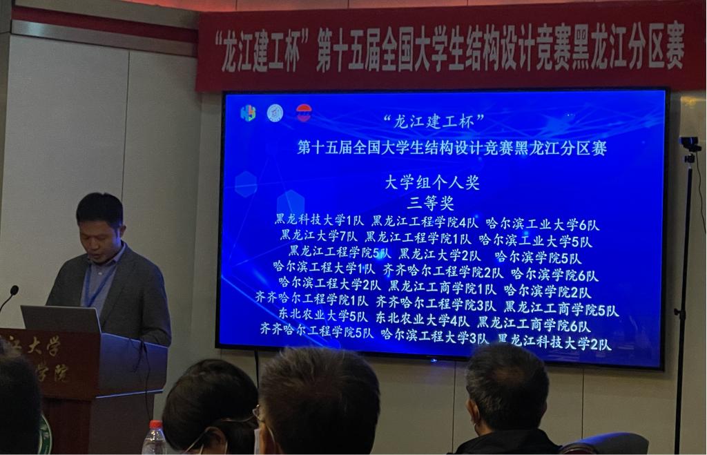 “龙江建工杯”第十五届全国大学生结构设计竞赛黑龙江分区赛于2022年9月23至25日在黑龙江大学举行,我院共有5支队伍参加此次竞赛。经过12小时模型现场制作和加载试验,我院参赛的5支队伍中有3支队伍获得个人二等奖、2支队伍获得个人三等奖,学校获得团体二等奖和优秀组织奖。