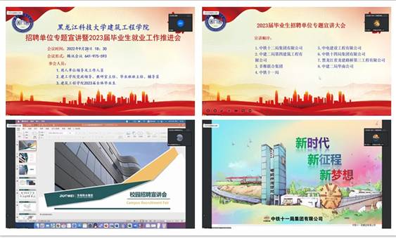 为充分利用好毕业生秋季就业最佳时期,促进2023届毕业生顺利就业、高质量就业,9月28日晚18点30分,beat365英国官网网站组织召开了用人单位招聘专场宣讲暨毕业生就业工作推进大会。会议采取线上形式、分两个阶段进行,会议由学院副处级辅导员展跃主持,中铁十四局集团有限公司等8家用人单位负责招聘的领导和工作人员、学院党政领导、教研室主任、毕业班班主任、辅导员和全体23届毕业生参加了会议。