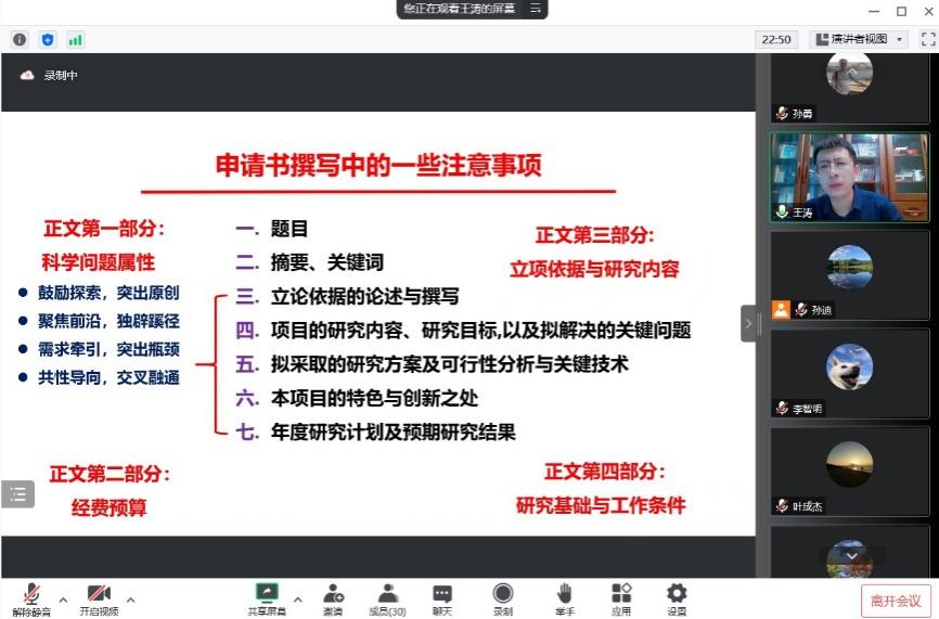 会上,王涛教授首先结合自己多年来坚持潜心研究、“十年铸剑”的亲身经历,同与会师生分享了关于申请国家自然科学基金的原始驱动力、申请前的准备工作、申请基金的心态、基金申请不能脱颖而出的原因等话题。随后,王涛教授针对在基金申请书撰写过程中的凝练科学问题、选题方法与原则、总体层次规划、申请书协作过程中常见问题,以及对摘要、关键词、立论依据、研究内容、研究目标与关键问题、研究方案与可行性分析、特色与创新之处等具体项目申报内容给出了详细的撰写建议。