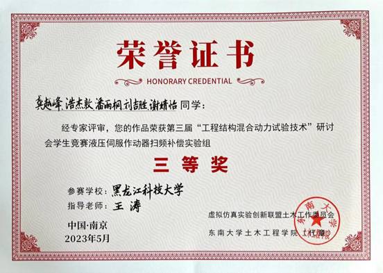 beat365英国官网网站王涛教授指导硕士研究生龚越峰、浩杰敦、潘雨桐、刘吉胜、谢婧怡在液压伺服作动器扫频补偿实验组竞赛。经过近两个月的精心筹备,我校参赛队伍在高手如云的队伍中脱颖而出,荣获三等奖。队员在学生竞赛中展示出缜密的学术思维、良好的理论功底和创新能力,得到了评委会专家的高度赞誉,大大提高了我校土木工程学科的学术声誉,也充分展示了我校研究生培养质量和教育教学水平。