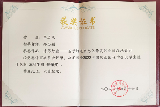近日,由中国风景园林学会主办,中南林业科技大学、湖南农业大学承办的2022年中国风景园林学会大学生设计竞赛落下帷幕,竞赛主题为“美美与共的风景园林:人与天调 和谐共生”。我院教师郑志颖指导,风景园林专业学生李历寒完成的参赛作品“珠落碧盘——基于河道生态化修复的小微湿地设计”在比赛中获得(本科生组)获佳作奖,这是我校风景园林专业在该赛事首次获奖。