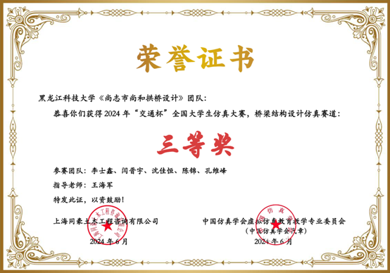 “交通杯”全国大学生仿真大赛由中国仿真学会作为指导单位,中国仿真学会虚拟仿真教育教学专业委员会、上海同豪土木工程咨询有限公司主办,长安大学公路学院承办。本次大赛吸引了来自全国131所高校530组作品参赛,通过线上初审选拔,最终共有46组入围作品约300人参加大赛总决赛。我院学子李士鑫、闫晋字、沈佳恒、陈锦、孔维峰获得桥梁结构设计仿真赛道全国三等奖。