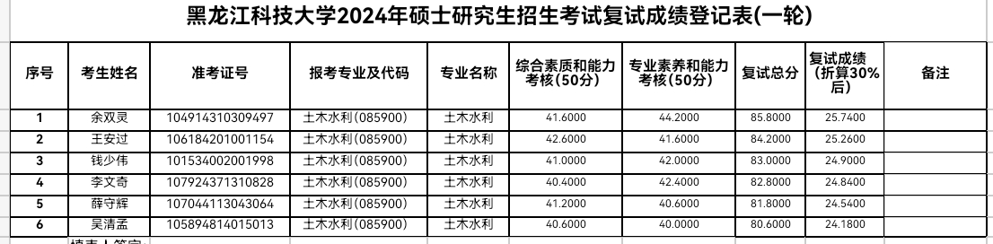 beat365英国官网网站2024年硕士研究生招生考试复试成绩登记表(一轮)土木水利