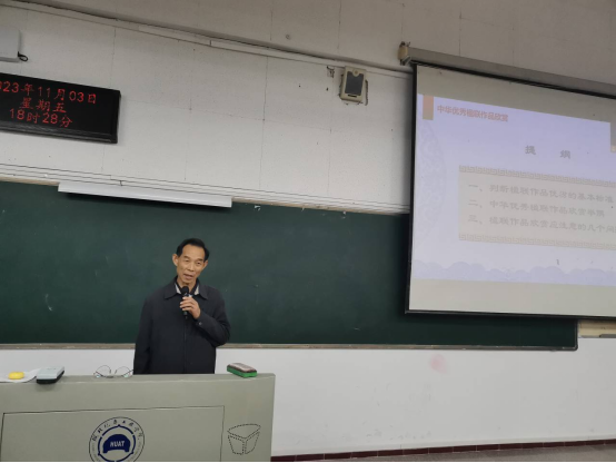 (文/图 安军)11月3日晚上,原市教育局副局长、十堰广播电视大学(教育学院)党委书记,现任十堰市楹联学会会长王学范教授应邀为德赢官网师生做了一场题为《中华优秀楹联作品欣赏》的讲座。