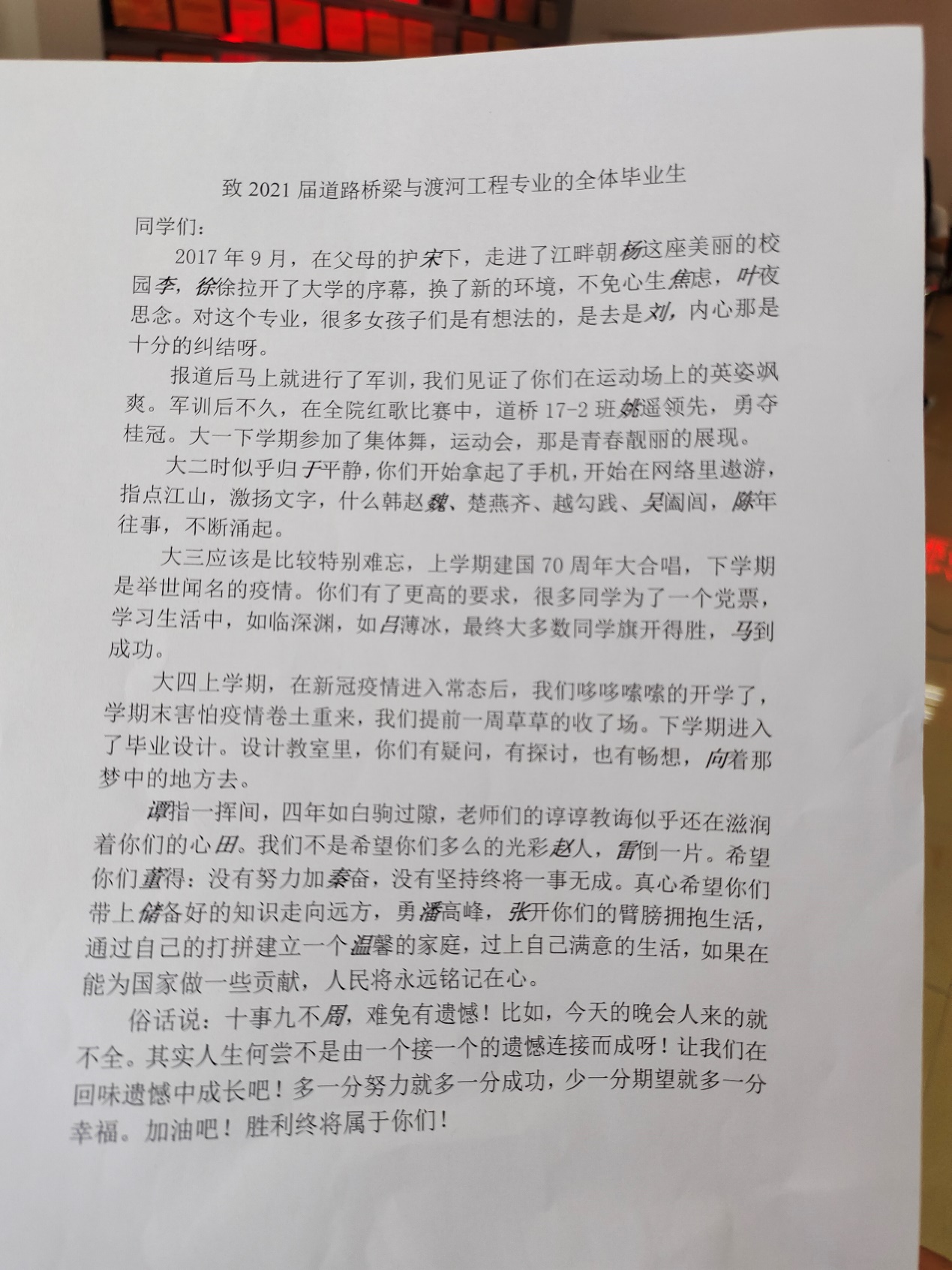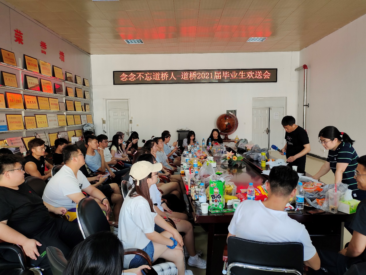在持续四个半小时的毕业欢送会上,孙勇、高霞老师参与了现场互动,董连成副院长、于秀娟等老师为学生们录制了短视频,道路桥梁与渡河工程教研室全体教师以各种形式为毕业生送上了临别祝福。同学们时而欢笑,时而落泪,高潮迭起,精彩纷呈,掌声不断。毕业欢送会后,道桥专业21届毕业生将陆续离校,开启自己人生的新征程。祝愿所有毕业生同学们永远年轻,永远充满激情,永远心存感动,未来可期,前程似锦!