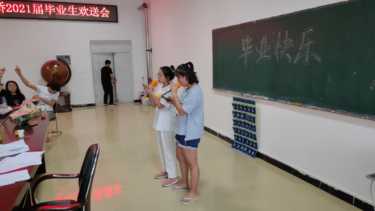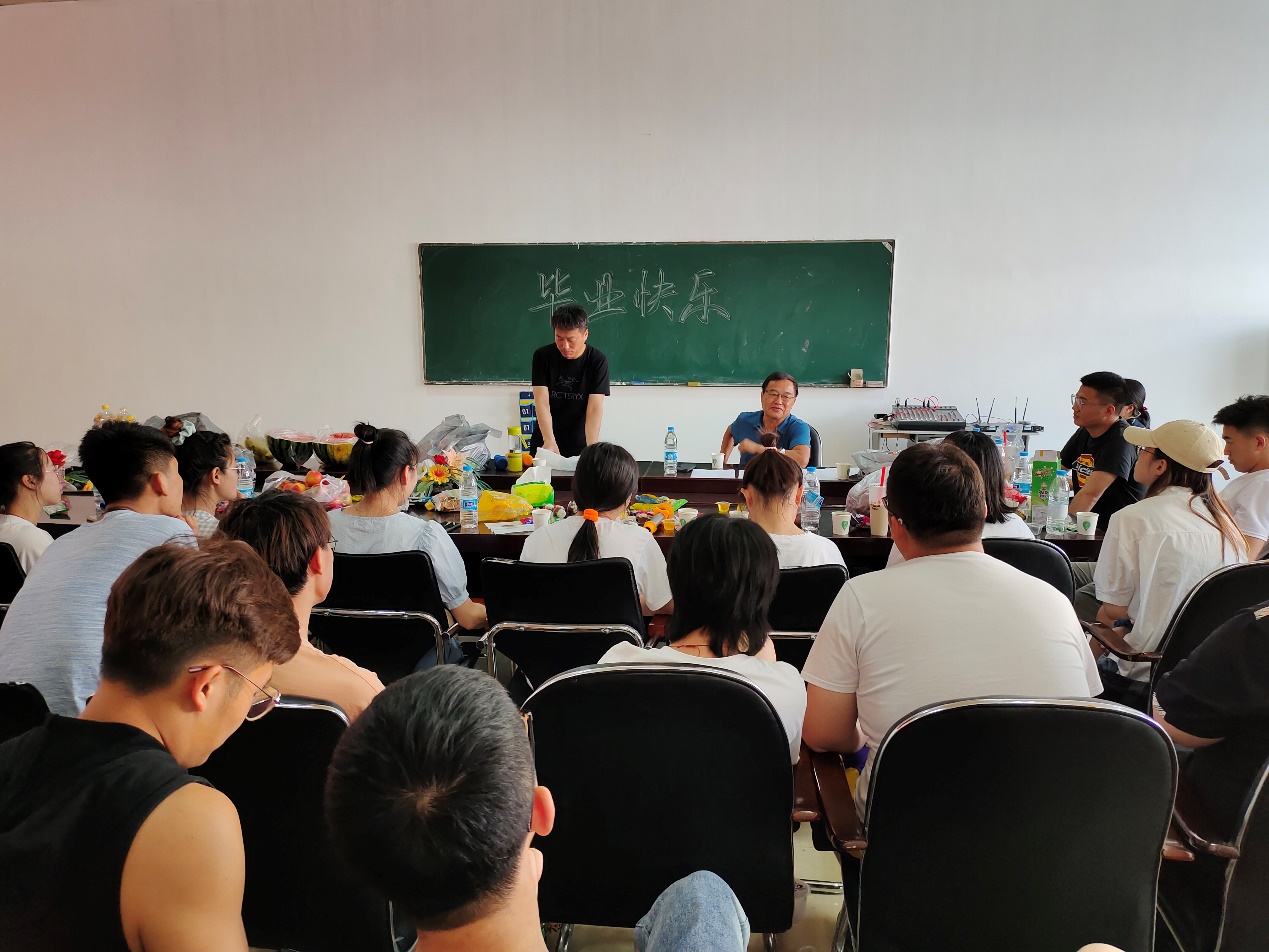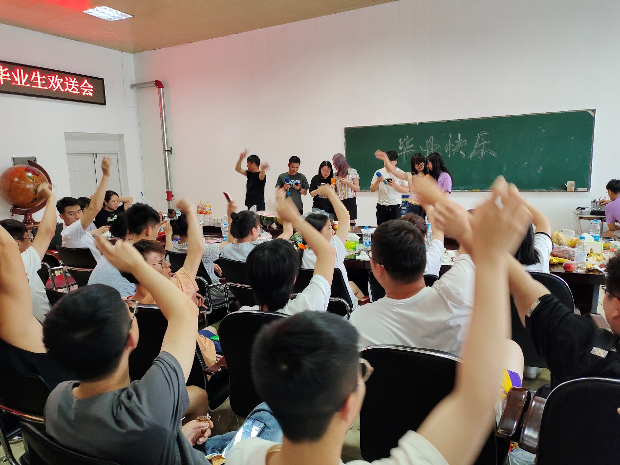 适逢庆祝建党百年,毕业欢送会在师生合唱《没有共产党就没有新中国》的歌声中拉开帷幕。杨海涛老师精心准备了一篇包含全体毕业生姓氏的“藏头散文诗”,深情回望了同学们大学四年以来的收获和成长。郭洪林书记推心置腹地为毕业生们送上了真诚的叮嘱和建议,讲话数次被掌声打断。郭书记带来的《小白杨》和《乌苏里船歌》两首歌曲为毕业欢送会的气氛带来了第一个小高潮,随后杨海涛老师演唱了《精忠报国》,孙勇老师演唱了《明天会更好》。同学们更是踊跃参与,分别以大合唱、小合唱和独唱等形式演绎了《再见》、《稻香》,《简单爱》,《北京东路的日子》,《你是人间四月天》,《信仰》,《十年》,小号演奏《友谊地久天长》等节目。还有反映大学生活的谜语、三句半、“热评老师”,以及集体表白“老师我爱你”等趣味互动环节。毕业欢送会在集体合唱《祝你一路顺风》,以及古诗词诵读祝福中圆满结束。