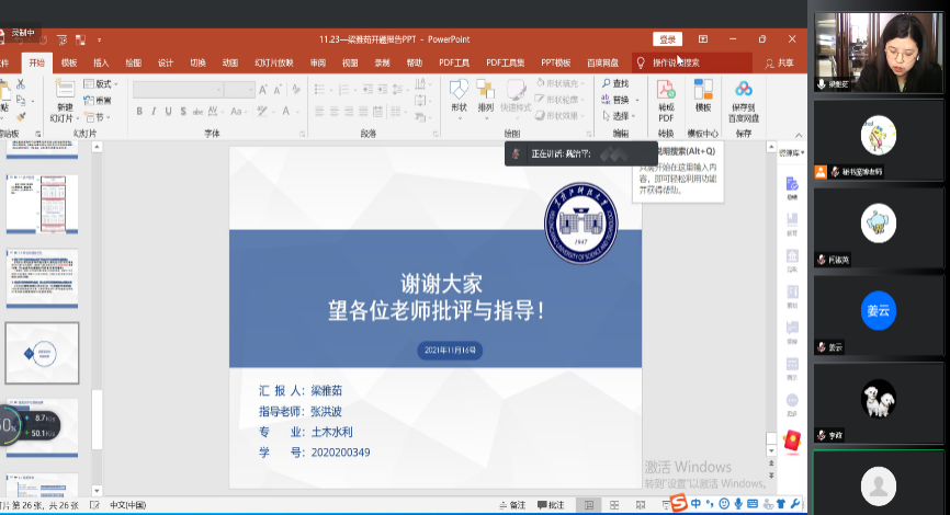 为保证研究生培养质量,beat365英国官网网站于近日召开了土木工程和土木水利领域2021秋季硕士学位论文开题答辩。其中,土木水利领域(城乡规划方向)开题答辩于11月23日召开,由于疫情防控需要,通过腾讯会议开展线上答辩,共有7位研究生参加。beat365英国官网网站姜云院长担任答辩组长,答辩委员会由5人组成,均为副教授以上职称,配备秘书1人;土木工程与土木水利领域于11月26日分为两组,采用线下答辩方式,共有34位研究生参加。beat365英国官网网站董连成副院长、姜封国副院长分别担任组长,每组答辩委员会由5人组成,均为硕士生导师,各组配备秘书1人。