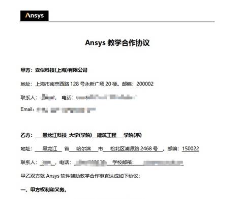 本次合作历经两个多月的接触、沟通并最终达成签约。按照约定:企业为学院上述两门课程提供软件使用授权、海量工程案例资源库、支持基于ANSYS系列软件的课外培训业务、认证ANSYS教学合作点与ANSYS教学和培训基地,并优先支持建立ANSYS创新仿真工程师考试中心等;学院为企业提供上述两门课程的课程大纲、课堂教学中开展的ANSYS软件案例教学、教学辅助算例,并允许企业在市场宣传与客户培训中使用。