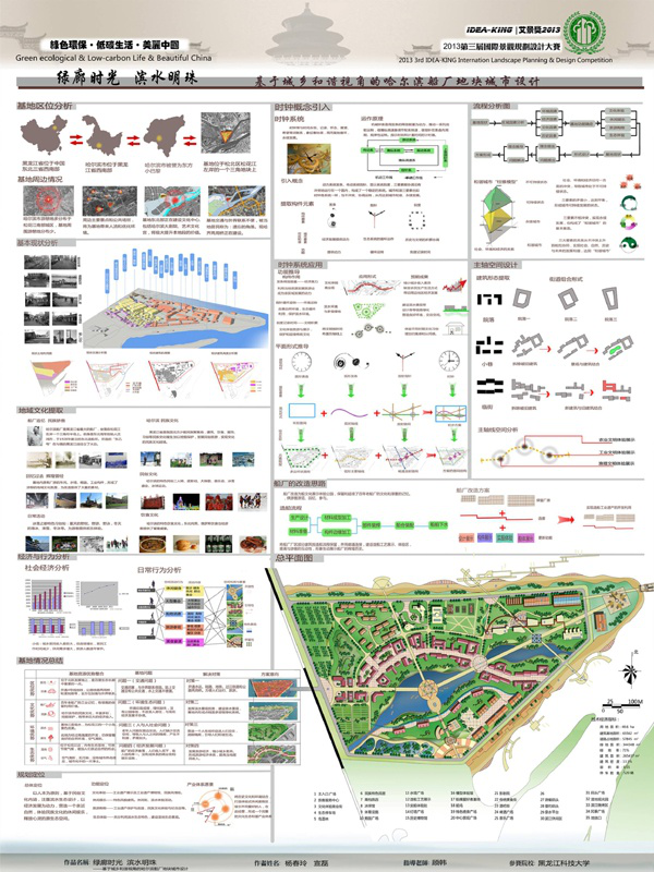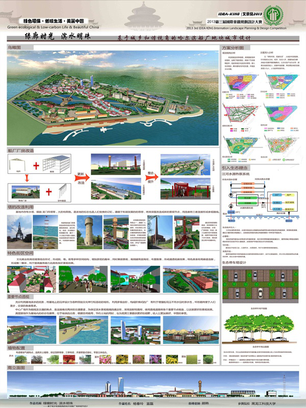 2013年3月18日至10月30日举行了2013年“艾景奖?第三届国际景观规划大赛”,该项赛事由国际园林景观规划设计行业协会(ILIA) 、 中国建设报社、北京林业大学教育基金会等共同主办。大赛以“绿色生态?低碳生活?美丽中国”为主题,内容涉及城市规划设计、旅游度假区规划、居住区环境设计等方面。本次大赛中,同济大学、东南大学、哈尔滨工业大学、华南理工大学、墨尔本皇家理工大学、韩国首尔大学等184所国内外高校、共计5618个组别参加了本次比赛。我校beat365英国官网网站城乡规划专业(原城市规划专业)的学生首次参加了此次比赛,在李冬梅、夏宏嘉等老师的指导下,我校4名学生凭借优秀的方案设计能力、过硬的图面表现能力及良好的心理素质,经过层层评选,激烈的竞争,最终获得骄人的战绩。黎洋佟、刘玉亭设计的“生命时续”——哈尔滨水泥厂更新改造设计,宣磊、杨春玲设计的“绿廊时光 滨水明珠——基于城乡和谐视角的哈尔滨船厂地块城市设计”均获得此次大赛城市规划设计组的银奖,开创了我校在此类国际大赛中获得优异成绩的先例。