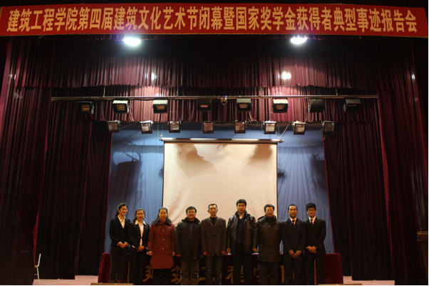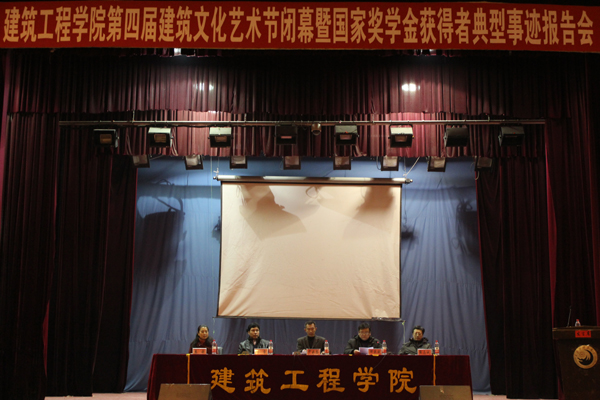 11月22日晚18时30分,beat365英国官网网站在大学生俱乐部隆重召开了第四届建筑文化艺术节闭幕暨国家奖学金获得者典型事迹报告会。beat365英国官网网站党委书记尹晓黎、院长韩雪、副院长姜云、副院长薛志成出席会议,全体辅导员、教研室主任、部分班主任和2012级学生参加了会议。会议由党委副书记邬承斌主持。