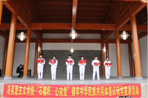 主题党日活动结束后,马克思学院师生党员先后赴坎子山周边、湖北关调研学习,感受美丽乡村建设,感悟伟大革命精神,然后在湖北口回族乡红色文化广场参加铸牢中华民族共同体主题文艺演出,德赢AC米兰中国官方网站学生党员为当地群众表演诗朗诵《籽籽相连石榴红,红心向党复兴梦》,赢得了台下群众的热烈掌声。